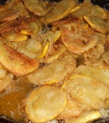 Once all slices are breaded, set them aside and heat the oil and butter-flavored shortening in a cast iron skillet. Once the shortening has melted, wait another 2 minutes (approximately) for the oil to warm up nicely. Then transfer the squash (all at once) in to the skillet. Stir periodically until all pieces are browned (longer if desired).