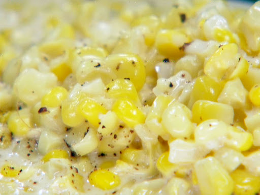 Husk the corn, and slice the kernels off the cobs, and place into a medium saucepan. Add the cream and bring to a boil, lower to a simmer, and let it cook and reduce until the liquid is thicker, the corn is plumped up, and the volume of liquid is reduced by about half, about 10 minutes.
