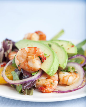 In a large mixing bowl, combine the greens, oranges, red onion, and pinch of salt. Whisk the vinaigrette, and add 3 tablespoons to the salad. Toss lightly to combine, and then divide the salad among four serving plates. Take 3 to 4 slices of the avocado and fan them out on top of each salad. Divide the shrimp evenly among the salads. Drizzle a little more vinaigrette over the shrimp and avocado, and serve immediately.
