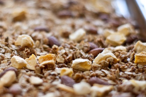 Pour onto a baking sheet and spread around evenly. Put the sheet in the oven and bake for about 45 minutes, or until the granola is golden brown. You may want to mix the granola about half way through for even browning. Remove from the oven and allow to cool completely on the baking sheet.