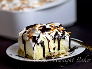 Spread whipped topping over pudding layer, making nice swirls. Sprinkle with toasted coconut. Microwave the hot fudge sundae sauce until pourable and drizzle over parfait.