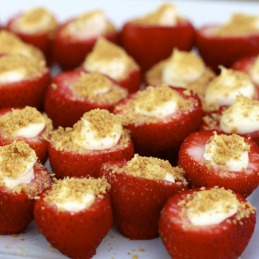 2. In a mixing bowl, beat cream cheese, powdered sugar, and vanilla until creamy. Add cream cheese mix to a piping bag or ziploc with the corner snipped off. Fill strawberries with cheesecake mixture. Once strawberries are filled, dip the top in graham cracker crumbs. If not serving immediately, refrigerate until serving.