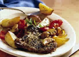 2. Mix potatoes, mushrooms, bell pepper and onion in large bowl. Spray vegetables 2 or 3 times with cooking spray; stir. Sprinkle with remaining herb mixture; toss to coat. Spread evenly in center of pan between pork chops.