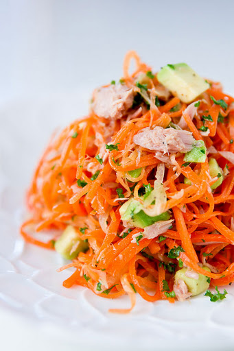 Put the squeezed carrot in a separate bowl, and then add the tuna, avocado, parsley, sesame oil and pepper. Toss to combine then adjust salt to taste.