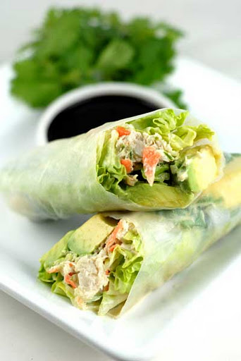 Place lettuce leaves on prepared rice paper, put 1/6th of the crab mixture on the lettuce leaves, add two slices of avocado and top with some cilantro leaves. Roll and cut in halve. Serve with extra wheat free soy sauce on the side.