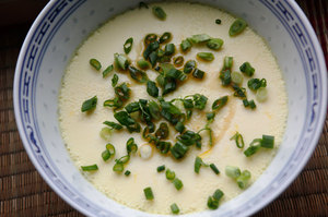Remove from the wok. Just before serving, sprinkle the scallion and drizzle the sesame oil (if desired) on top of the custard. Garnish and serve.