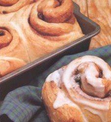 Roll dough into a 10x12 inch rectangle. Brush with melted margarine. Sprinkle with sugar, cinnamon and raisins. Starting on the short side, roll dough up. Cut crosswise into four slices. Place slices in an 8 inch squaare baking pan. Cover rolls with sprayed plastic wrap. Let rise until double in size. Remove wrap and bake at 350° F. for 15-20 minutes. Remove from pan and ice while still warm.