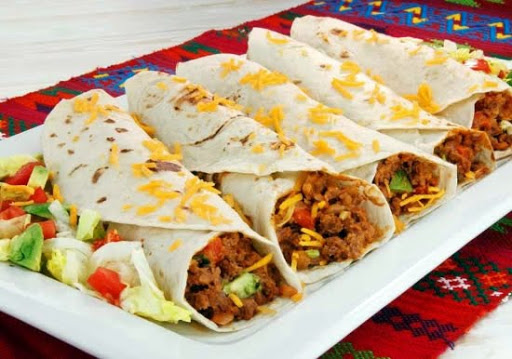 In a large frying pan, heat olive oil or cooking spray over med-heat. Add onion and red pepper and cook until softened, 3-4 minutes. Add beans, scallions, spices, milk and salt. Cook until heated through, stirring often, about 8 minutes. While the filling is cooking, heat the tortillas. You can steam them, microwave them (10 seconds) or flip them every few seconds in a non-oiled hot frying pan. Fill burritos with some of the bean mixture, some meat, some cheese, lettuce, tomato and avocado. For a 10" tortilla, about 1/3-½ cup bean mix, ¼ cup cooked chicken or steak, 2 Tbsp. shredded ultra sharp cheddar, ½ cup chopped lettuce, 3 Tbsp. diced tomato and 1/8 of an avocado. Roll up and eat.