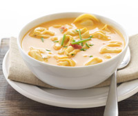 In a medium saucepan, bring broth to boiling. Add tortellini; reduce heat. Simmer, uncovered, for 5 minutes. In a bowl, whisk 1/3 cup of the hot broth into the cream cheese spread until smooth. Return all to saucepan along with tomato soup; heat through. Sprinkle with chives before serving. Makes 4 servings.