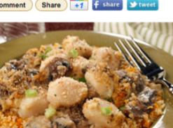 Pour over scallops and mushrooms; sprinkle with bread crumbs.