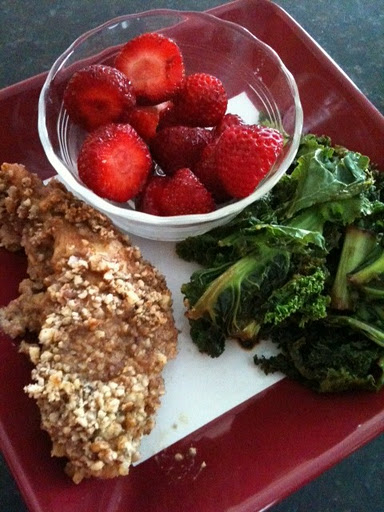 Transfer chicken to the chopped pecans and again cover both sides. Place coated chicken into a greased glass baking dish (I used a little olive oil spray to cover the bottom of the dish) and sprinkle each chicken breast with just a little sea salt.