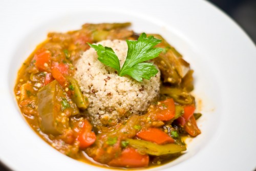 I served this with some red and yellow Quinoa for some extra protein, but it would also work great with some cous cous or flat bread. One of the great things about this is that you can really use just about any veggie. Squash, okra, green beans, carrots, or pumpkin would all work with the tomatoes and onions.