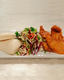 Transfer chicken and chiles to a paper towel-lined plate to drain. Serve with slaw and steamed buns. Garnish with lime and cilantro, as desired.