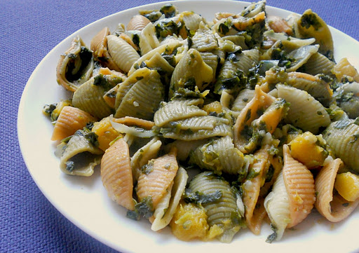 Cook the pasta according to package directions. Heat olive oil in a large saute or saucepan over medium to medium high heat. Add squash, onion, spinach and garlic. Saute until squash is tender, adding more olive oil if necessary. Reduce heat. Add the pasta to the vegetables and stir to combine. Season to taste & enjoy!