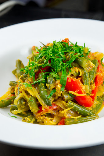 When the green beans are done, taste for salt and spice and adjust as needed. When the flavor is to your liking, turn off the heat and stir in the yogurt. Top the green bean curry with minced cilantro and serve immediately with some basmati rice or naan
