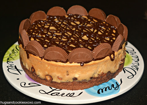 Remove from oven and sprinkle on choc chips, peanut butter chips and the peanut butter cups. Lower oven to 325!!!!! Pour the cheesecake batter right on top (directions below)