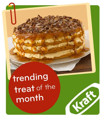 BEAT cream cheese in medium bowl with mixer until creamy. Add sugar, remaining pumpkin and spice; mix well. Gently stir in COOL WHIP. Cut each cake layer horizontally in half with serrated knife; stack on serving plate, spreading cream cheese filling between layers. (Do not frost top layer.) Drizzle with caramel topping just before serving; top with nuts. Refrigerate any leftovers.
