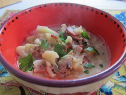 Once your cauliflower and onion is sautéed, add quinoa flour and mix together. Add clam juice and allow the juice to come to a boil. Once boiled, turn down heat and allow to simmer until your cauliflower is tender.