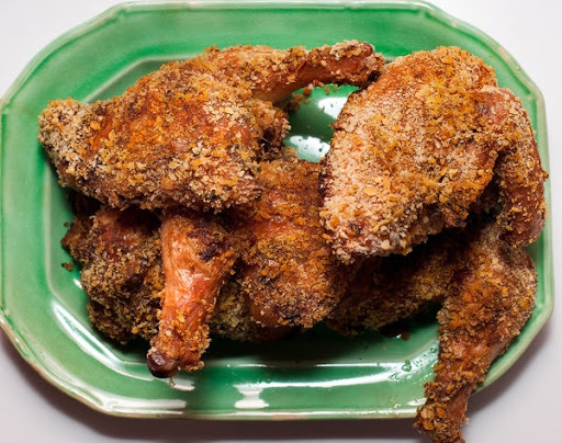 This old-school chicken, Sunday-night-supper chicken, even dinner party chicken, is baked for about two hours (yes, you read that correctly: two hours) until its bread crumb-coated skin is crisp — yet the meat miraculously maintains its moisture. The recipe, adapted from the great food writer Laurie Colwin, is so simple to make that her original version was written out in a brief paragraph, casually instructing the home cook to coat the chicken with mustard, garlic, a little thyme, a pinch of cinnamon. We have adapted the recipe to include measurements and more specific direction, but that shouldn’t stop you from absorbing her nonchalance and confidence as you make it, the certainty that it will turn out delicious every time.