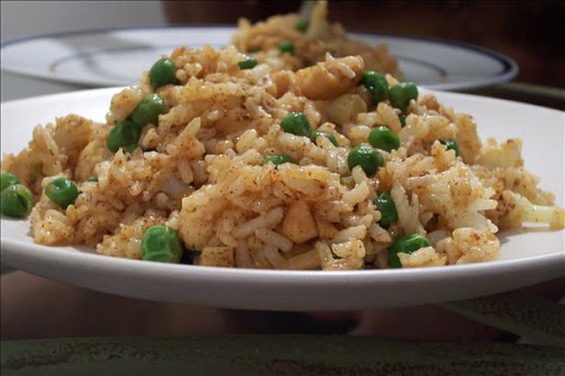 Add rice, stirring well to coat with the spices, and fry until heated through and well mixed.