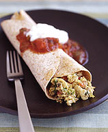 Place a tortilla on a flat surface, spoon 1/4 of egg mixture onto center of tortilla and roll up tortilla. Fill remaining tortillas with remaining egg mixture, then place tortillas side-by-side in prepared baking dish, lightly coat with cooking spray.