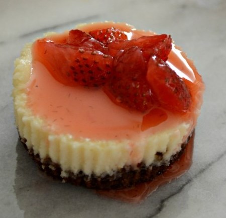 Top each cheesecake with a spoonful of strawberry topping before serving.