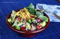 When you’re ready to serve, add avocado, tortilla strips, and dressing. Gently combine and serve.
