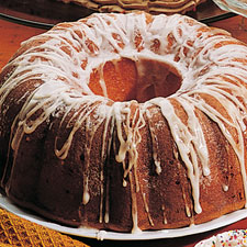 Brush the surface of the cake with some of the rum or vanilla syrup. Allow it to cool in the pan for 15 minutes, then turn it out onto a serving plate. Brush with the remaining rum or vanilla syrup. Cool completely before mixing glaze ingredients together. Drizzle with glaze. Yield: 12 to 16 slices.