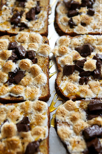 Place soaked bread on the baking sheet in a single layer. Top each slice with 1/4 cup of the marshmallows and some chocolate. Bake for 15 to 20 minutes or until the marshmallows are browned to your liking and the chocolate is melted. Remove from pan with a flat spatula.