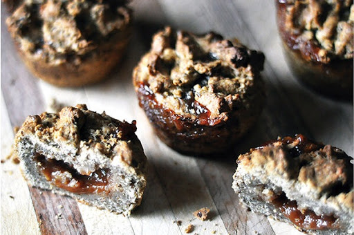 Reserving about a quarter of the dough for topping, scoop 2 tablespoons dough into each cup. Using the back of a spoon, press dough gently down into the cups. The dough will move up the sides, and there should be a shallow well in each dough cup. Don’t worry if the dough doesn’t come all the way up to the top; there should be about 1/2 inch of space between the top of the dough and the rim of the cup.