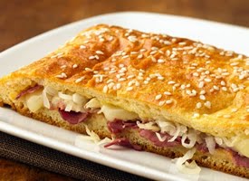 2. Unroll remaining can of dough on work surface. Spread mustard to within 1/2 inch of edges. Place mustard side down on sauerkraut. Press edges with fork to seal. Brush with egg. Sprinkle with sesame seed.