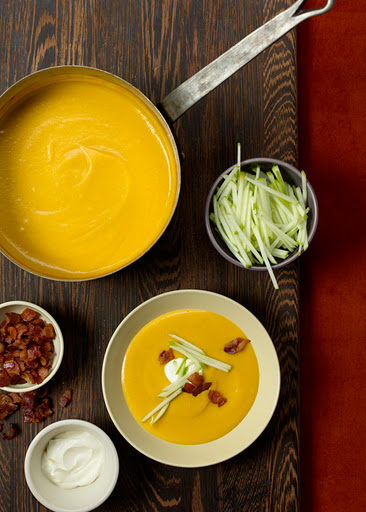 Serve soup topped with sour cream, bacon, and apple matchsticks.