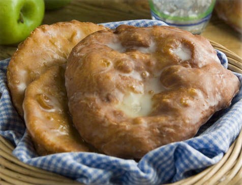 For glaze, whisk together powdered sugar and milk. Brush warm fritters with glaze and serve when glaze has set.