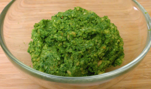 A thick yummy paste of arugula, toasted almond oil, and more. A perfect topping for pasta or to put in soups or stews.