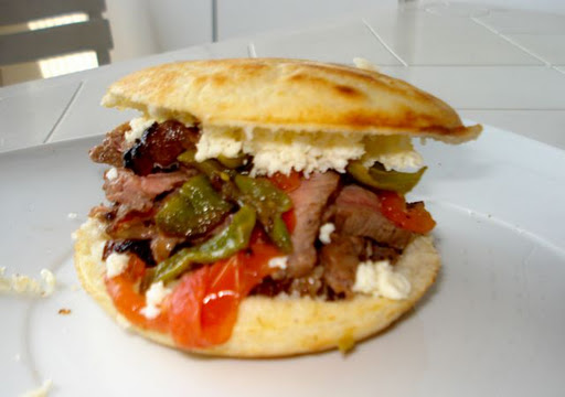 El relleno principal de la arepa es la carne, para cada arepa aso un churrasco de unos 200 gramos a término medio y que luego corto en tiras finitas. La arepa la relleno con el churrasco asado, le agrego un sofrito de tomate con Pimientos de Padrón, que le dan un toque picante muy sutil, y al final cubro con quesofresco rallado o requezón. 100% Recomendado!
