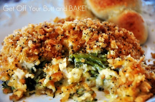 Melt the butter, and add the poppy seeds, and stir well. Crush Ritz crackers in large zip-lock bag with a rolling pin. Don’t crush too small. Add crumbs to the melted butter. Sprinkle crumbs over the top of the grated cheese.