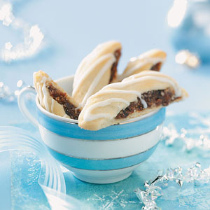 To form the cookies, have ready the filling, the chilled dough pieces, the egg wash with a pastry brush, and a sharp knife. Paint the edges of the dough pieces with egg wash and place 1 teaspoon of filling shaped into an oval in the center of half the pieces. Top each with a second piece of dough and carefully pinch the edges together to seal. Trim the excess dough from around the edges.