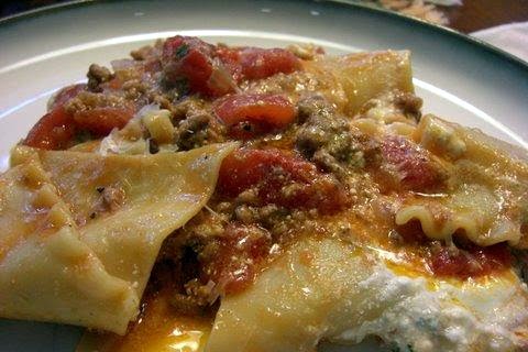 4. Sprinkle the noodle pieces evenly over the meat, but do not stir. Pour the diced tomatoes with their juice and tomato sauce over the pasta. Cover and bring to a simmer.