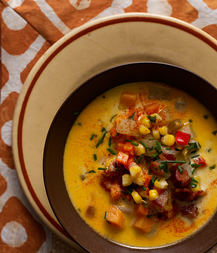 Remove pot from heat, then stir in cheese until melted. Season soup with salt and pepper and stir in bacon and basil. Garnish with fresh chives, scallions, or paprika (if desired).