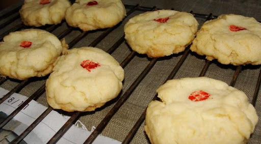 Place on ungreased baking sheets. Dip chopstick into red food color and make a depression into the center of each cookie. Bake in 350 degree oven for 15-18 minutes. Cool and store in tightly covered container.