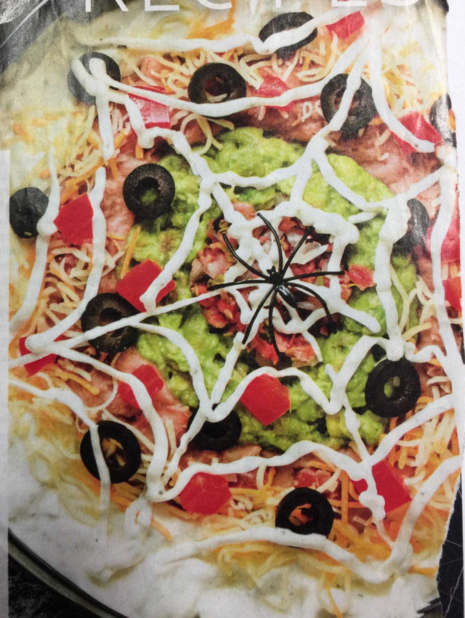 Start with a layer of refried beans at the bottom, the dip, salsa, tomato, cheese, black olives, and guacamole as the top layer.