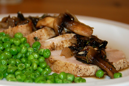 Cover and reduce heat to low, cook 30-40 minutes or until meat is fully cooked (155 degrees (F) when thermometer is pushed into the center of loin.) 10 minutes into cooking, add whole wrapped cloves of garlic, thyme, sage, rosemary, and bay leaves into pan. Re-cover and continue cooking.