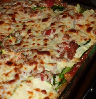 Layer ingredients in a large lasagna pan (zucchini, tomatoes, spinach, ricotta, pesto, sauce - repeat another time and add one more layer of zucchini then the last bit of sauce). Top with mozzarella if desired.
