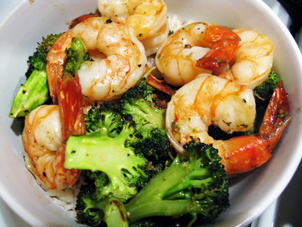 2. Meanwhile, toss together one pound large shrimp, shelled and deveined, with 2 Tbs olive oil, lemon zest from one lemon, 1/2 tsp salt and 1/2 tsp pepper (I just eyeball the salt and pepper) in a bowl. When the broccoli’s been in the oven 10 minutes, add the shrimp to the broccoli and toss (carefully.)
