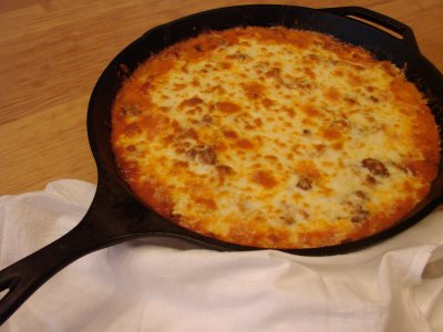 8.Sprinkle top with mozzarella cheese, put in oven to broil until spotty brown. (stand there and keep watch or set a timer for 3 minutes at a time until it’s ready, or else you may end up with Blackened Hillbilly Spaghetti Pie!)