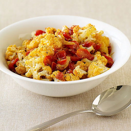 Add remaining 2 teaspoons oil, tomatoes, garlic, salt and pepper, cook, stirring, until tomatoes soften and cauliflower is tender, about 3 minutes.