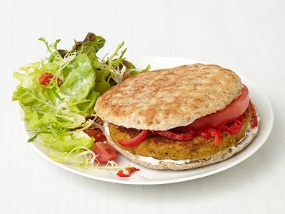 Put the falafel patties on the sandwich thins; top with the sliced tomato and the remaining yogurt dressing and pickled peppers. Serve with the salad.