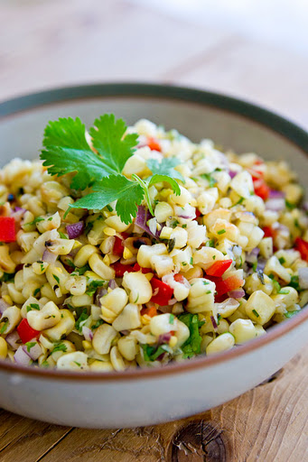 Grill or broil the corn over high heat until it is speckled black on all sides, rotating each ear to make sure it roasts evenly. Allow the corn to cool enough to handle. Use a sharp knife to remove the kernels of corn into a bowl, then add the bell pepper, red onion, cilantro, olive oil, lime juice, salt and dried oregano. Stir to combine, taste for salt and adjust to taste.