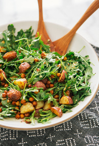 - Combine arugula, potatoes, chickpeas in a large serving bowl and dress to your preference. Give it a few tosses, add finishing salt to taste and serve warm!