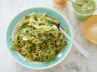 In the bowl of a food processor fitted with a steel blade, puree the pesto, spinach, and lemon juice. Add the mayonnaise and puree. Add the pesto mixture to the cooled pasta and then add the Parmesan, peas, pignoli, salt, and pepper. Mix well, season to taste, and serve at room temperature.